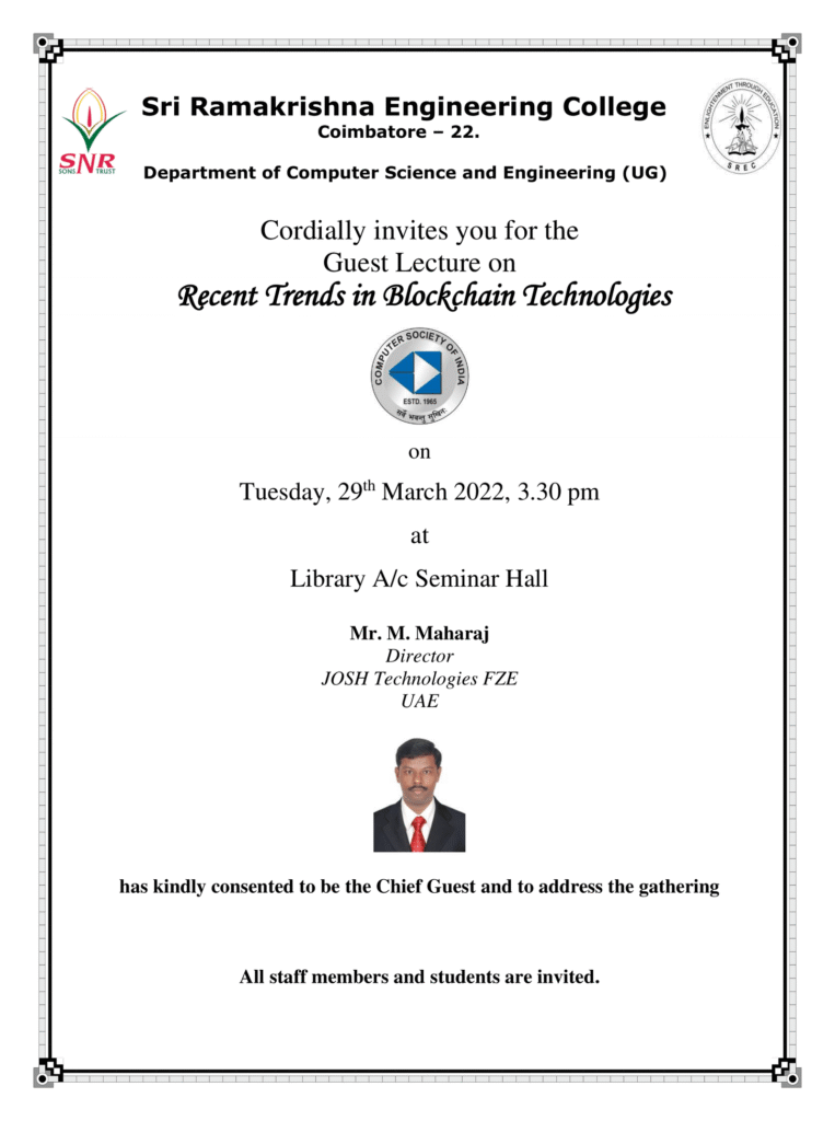 8. Guest lecture titled “Recent trends in Blockchain Technologies” in Sri Ramakrishna Engineering College on 29th Mar 2022