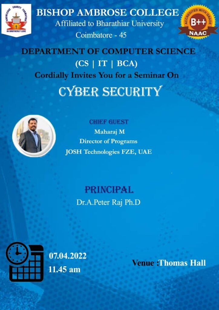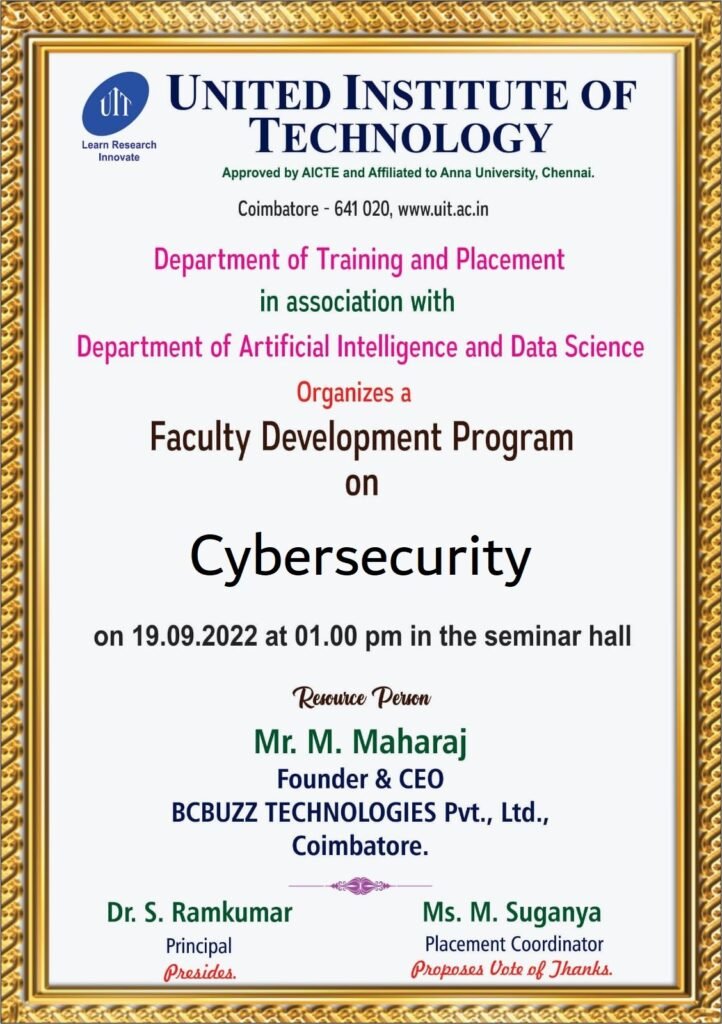 34. Two days Workshop in Cybersecurity on 27th & 28th Oct 2022 – Bharathiar University