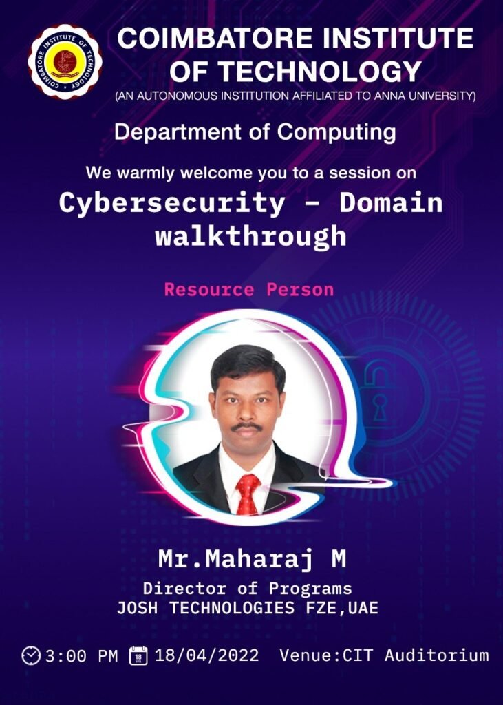 11. Guest lecture “Cybersecurity – Domain walkthrough” in Coimbatore Institute of Technology on 18th Apr 2022