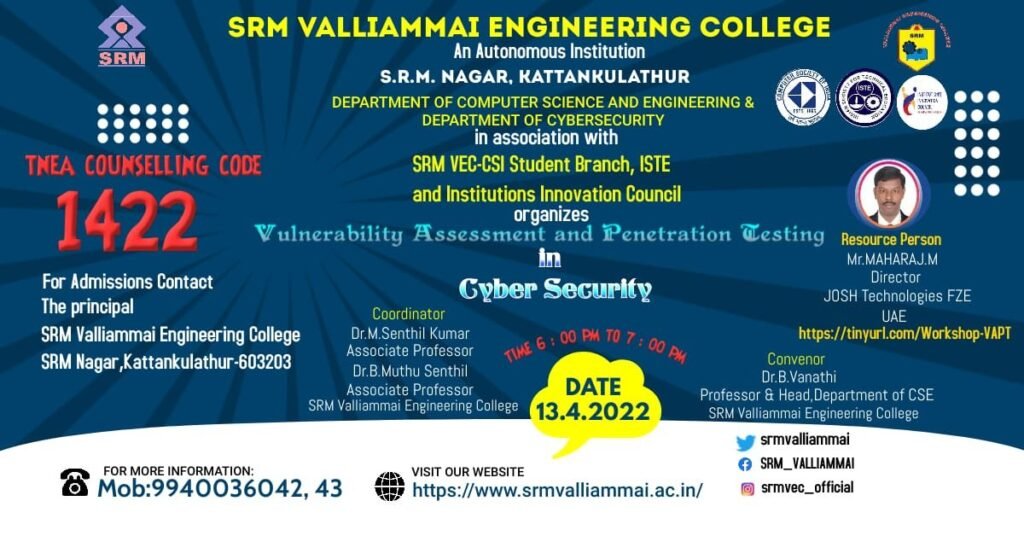 10. Webinar about “Vulnerability assessment and Penetration testing in Cybersecurity” in SRM Valliammai Engineering College on 13th Apr 2022