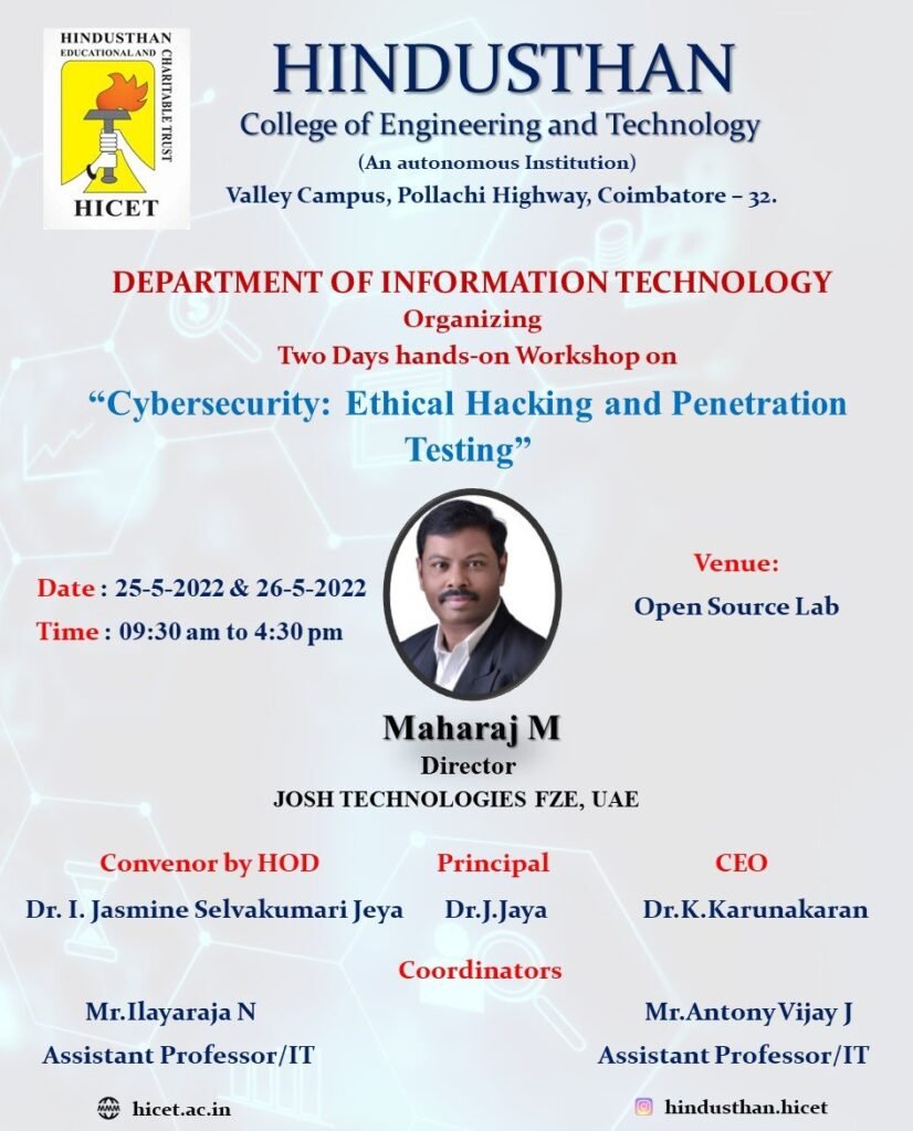 16. Two days hands-on Workshop on “Cybersecurity: Ethical Hacking and Penetration Testing” in Hindusthan College of Engineering and Technology on 25th and 26th May 2022