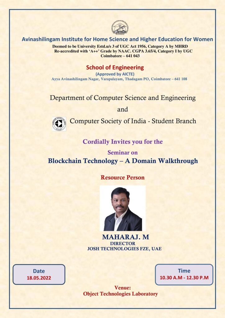 14. Seminar on “Blockchain Technology – A Domain walkthrough” in Avinashilingam Institute for Home Science and Higher Education for Women on 18th May 2022