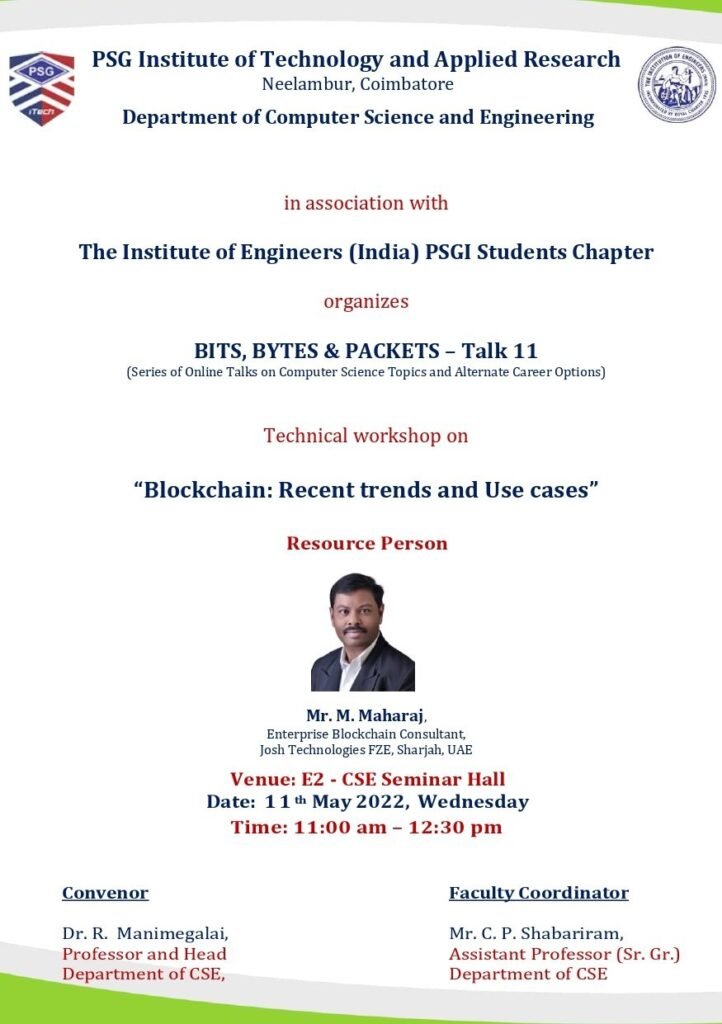 12. Technical workshop “Blockchain: Recent trends & Use cases” in PSG Institute of Technology and Applied Research, Coimbatore on 11th May 2022