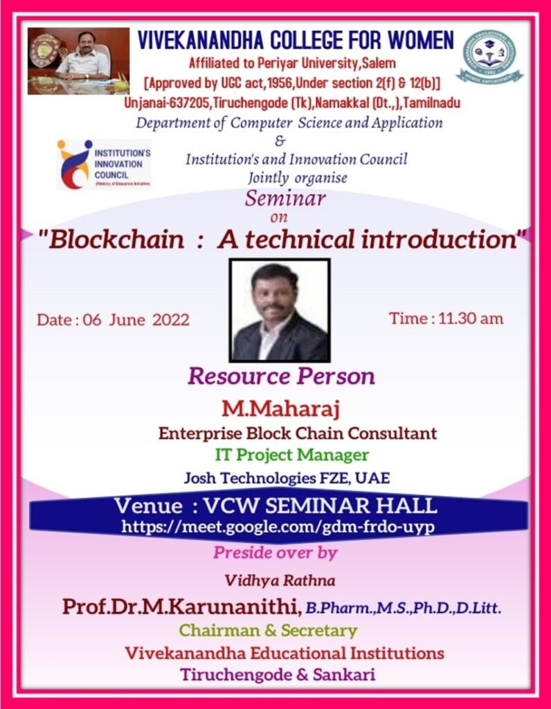 18. Seminar on “Blockchain : A technical introduction” in Vivekanandha College for Women on 6th June 2022