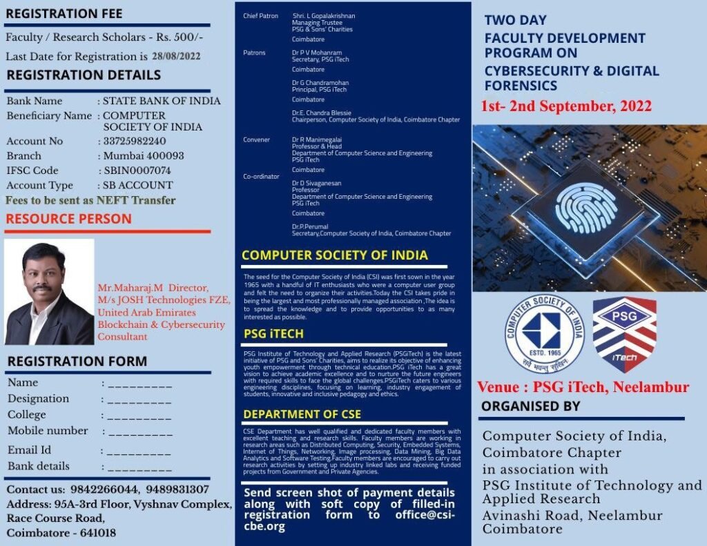 23. 2-days FDP – Faculty Development Program in “Cybersecurity & Digital Forensics” on 1st and 2nd September 2022 – 44+ Faculties from 20 Academic Institutions in Coimbatore district participated