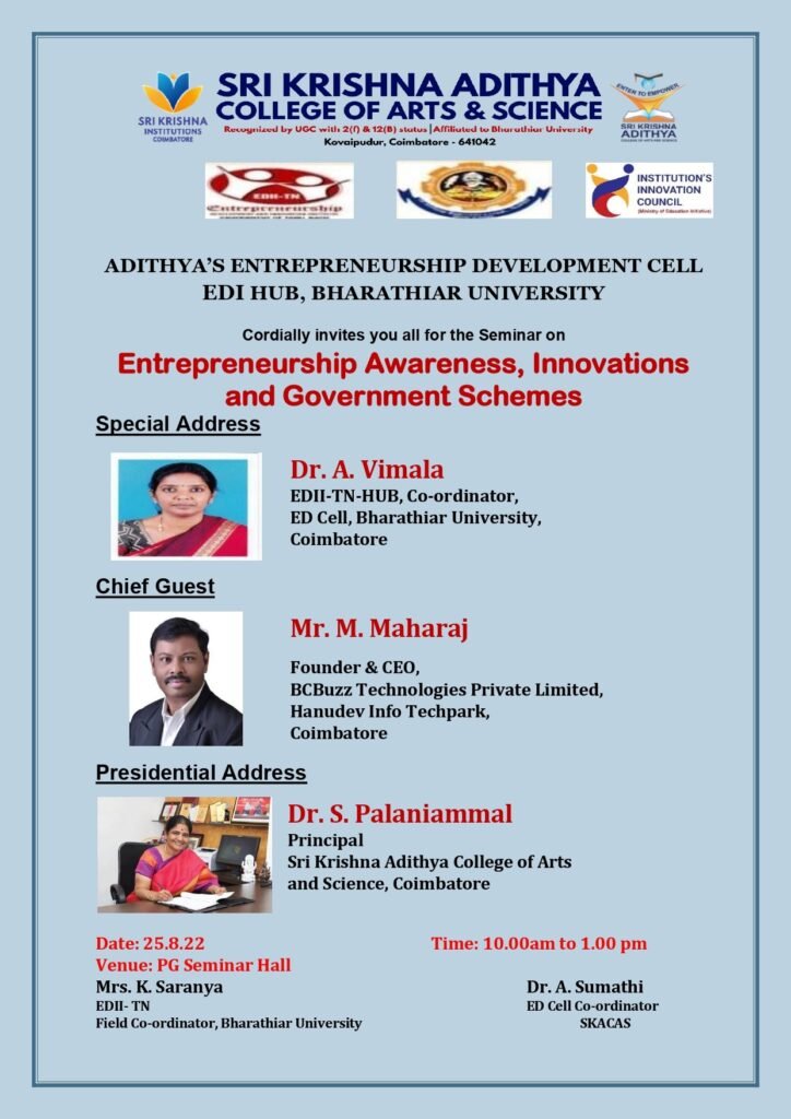 20. (Tentative) – Guest talk titled “Role of Entrepreneurship in Economic Development” in Sri Krishna Aditya Arts and Science College on 6th August 2022