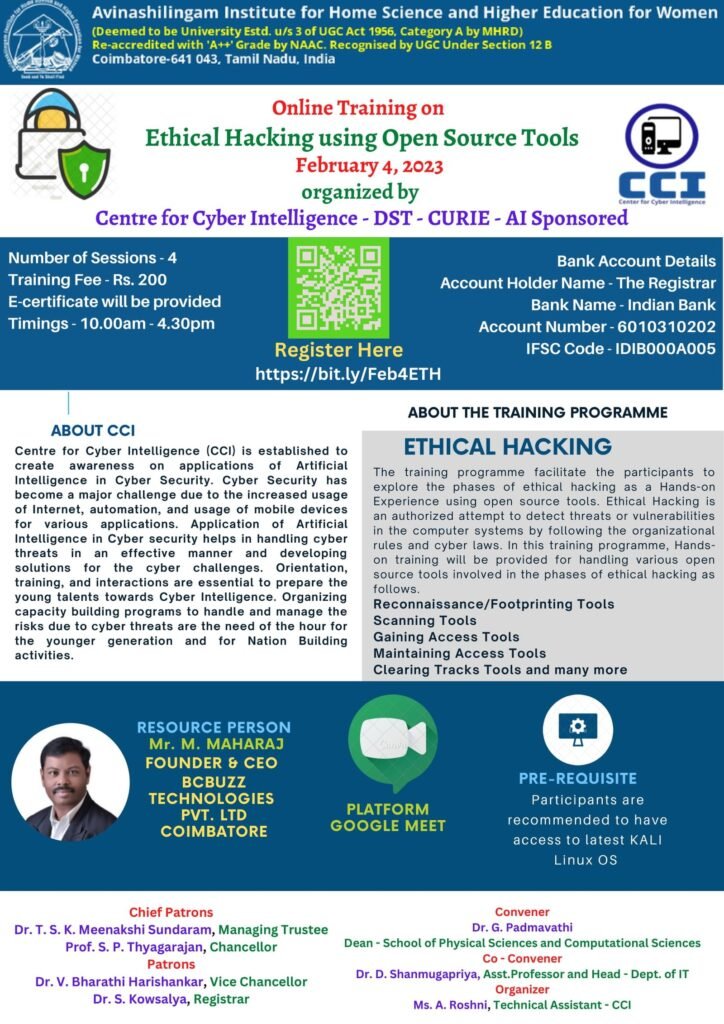 46. Online training on Ethical Hacking using Open Source Tools organized by Centre for Cyber Intelligence – DST – CURIE – AI Sponsored
