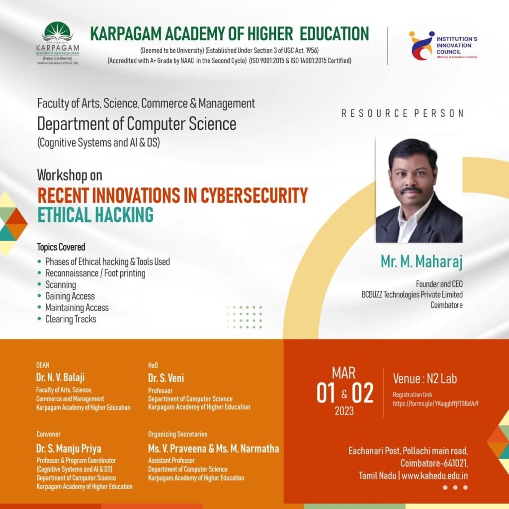 51. 2 days workshop on Cybersecurity : Ethical Hacking – Department of Computer Science – Karpagam Academy of Higher Education