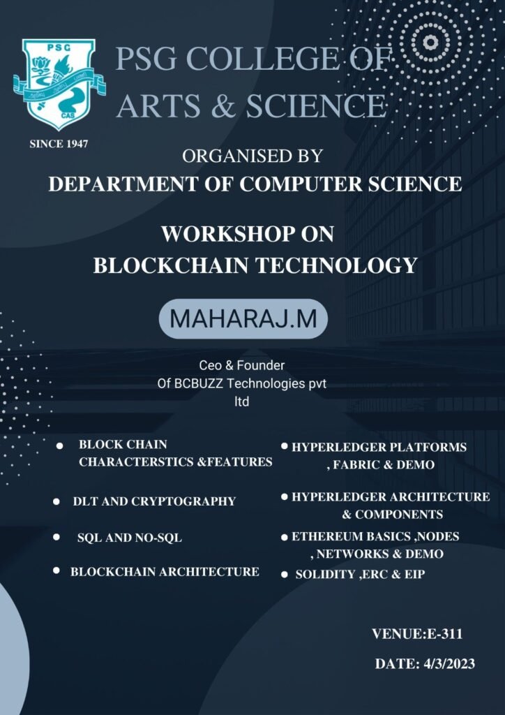 52. 1 day workshop on Blockchain Technologies – Department of Computer Science – PSG College of Arts and Science