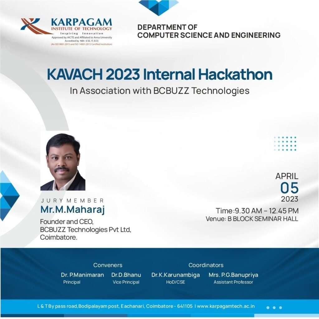 67. Jury member for KAVACH 2023 internal Hackathon in Karpagam Institute of Technology on 5th April 2023